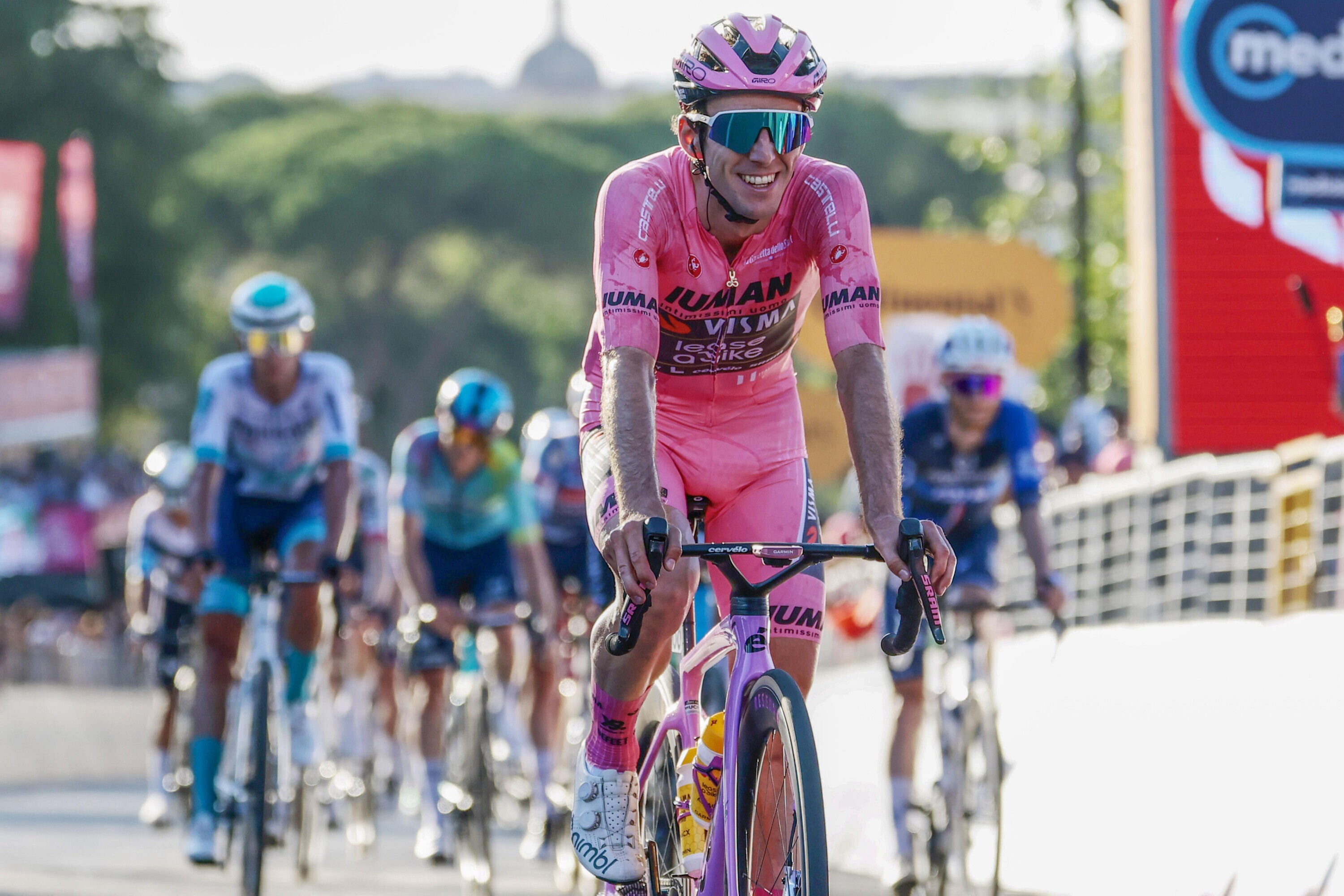 Team Visma | Lease a Bike en titelverdediger Simon Yates waren vandaag aanwezig bij de presentatie van het parcours van de Giro d’Italia 2026 in Rome, waar een interessant routeprofiel met zware bergetappes en een lange tijdrit werd onthuld.