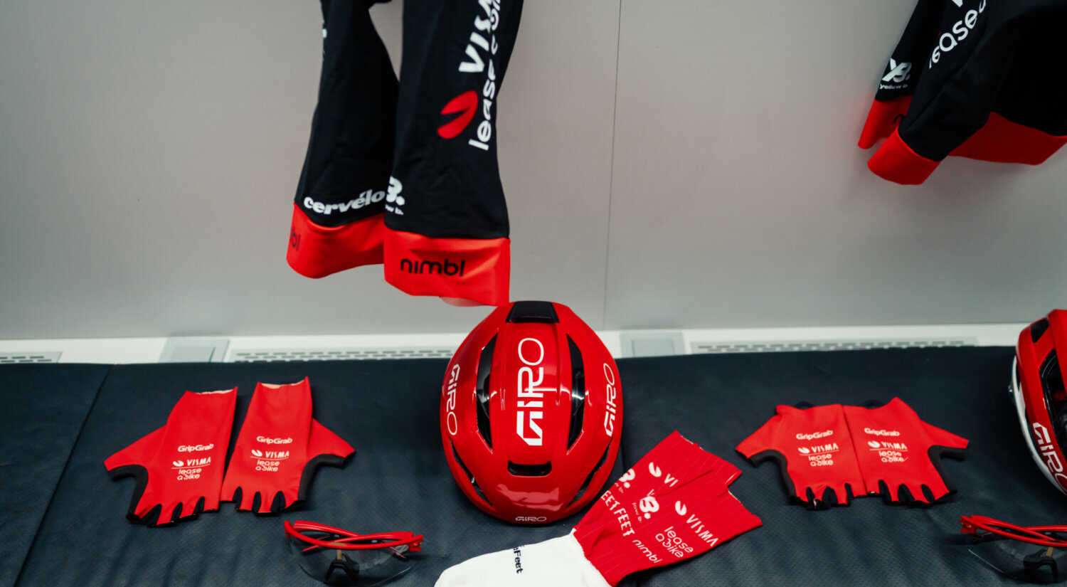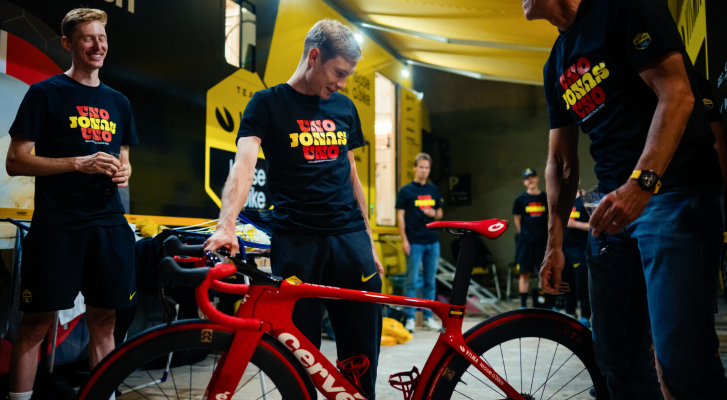 Exclusief verkrijgbaar bij Team Visma | Lease a Bike: de rode leiderstrui van Jonas Vingegaard en bijpassende wielerhandschoenen en aero wielersokken.