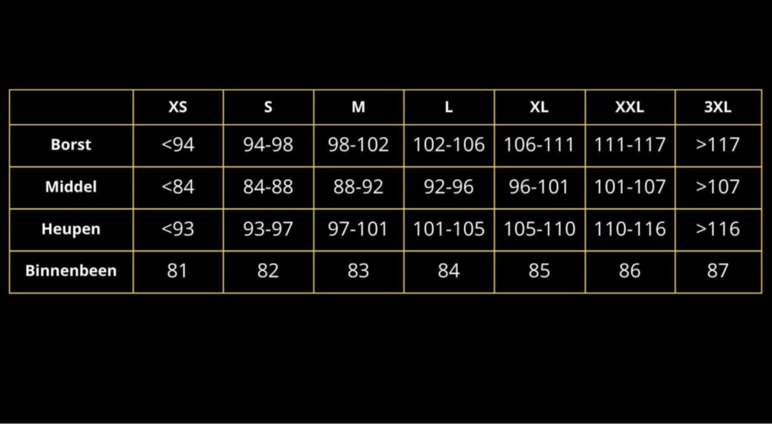 Alle omtrekken worden gemeten in cm.